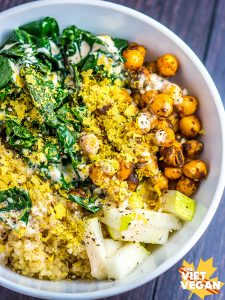 Quinoa Bowl with Chilli Spiced Chickpeas, Wilted Kale, Pear, and Garlic Chipotle Mayo